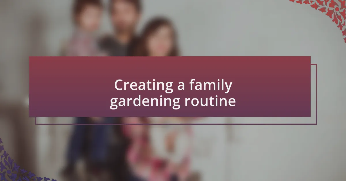Establishing a consistent family gardening routine has made a world of difference in our experience. Each Saturday morning, we dedicate time to the garden, turning it into a cherished family tradition. I remember the first time my kids and I planted seeds together; the laughter mixed with dirt-smudged faces created lasting memories that we still talk about today. How special it is to have those moments on the calendar—they become our time to connect with nature and each other.